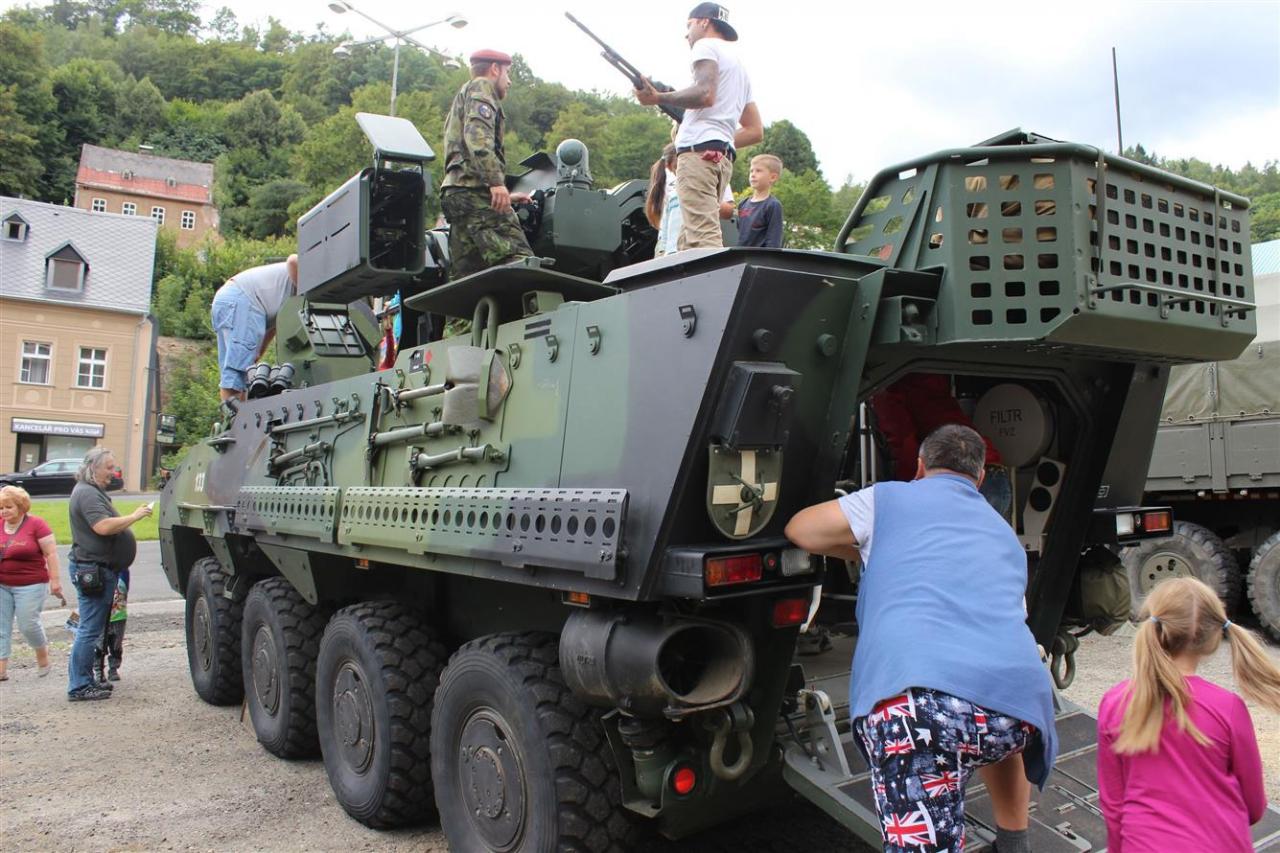 Nedělní program pokračoval od 13 hodin ukázkou vojenské techniky Armády České republiky v prostoru po bývalém Hornickém domě. Ukázka byla velkým zážitkem především pro děti. Byla možnost vyzkoušet si střelbu ze samopalu na trenažéru a prolézt si vojenská vozidla, např. Pandur. Během akce byl panem Ing. Václavem Šrámkem předán starostovi města seznam jáchymovských legionářů za První světové války a jáchymovských občanů, kteří za druhé světové války bojovali proti nacistickému Německu. Pan starosta slíbil, že seznamy budou v nejbližší době přepsány do kroniky města.